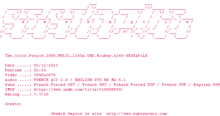 Voir le nfo de la release The.Color.Purple.1985.MULTi.2160p.UHD.BluRay.x265-SESKAPiLE