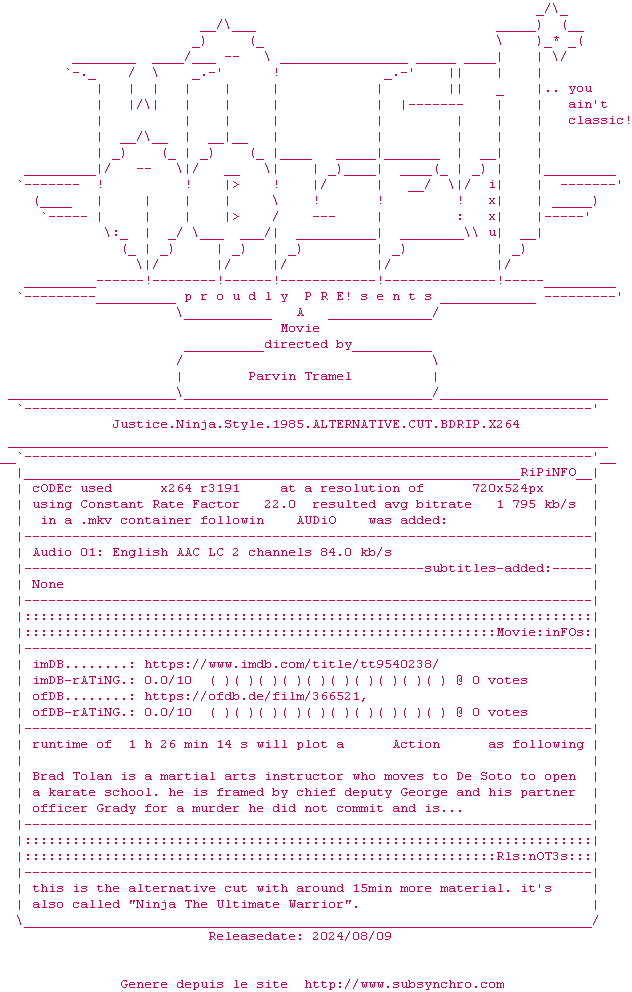 Voir le nfo de la release Justice.Ninja.Style.1985.ALTERNATIVE.CUT.BDRIP.x264-WATCHABLE
