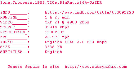 Y avez-vous pense ? Nous proposons déjà 1901 sous-titres pour le film Zone Troopers. Avez-vous essaye de voir si ces sous-titres etaient compatibles avec cette release ? On vous laisse le soin de tester cela pour nous et de contribuer au site en postant le sous-titre en cas de compatiblite constatee !