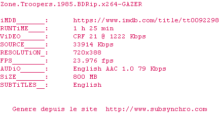 Y avez-vous pense ? Nous proposons déjà 1901 sous-titres pour le film Zone Troopers. Avez-vous essaye de voir si ces sous-titres etaient compatibles avec cette release ? On vous laisse le soin de tester cela pour nous et de contribuer au site en postant le sous-titre en cas de compatiblite constatee !