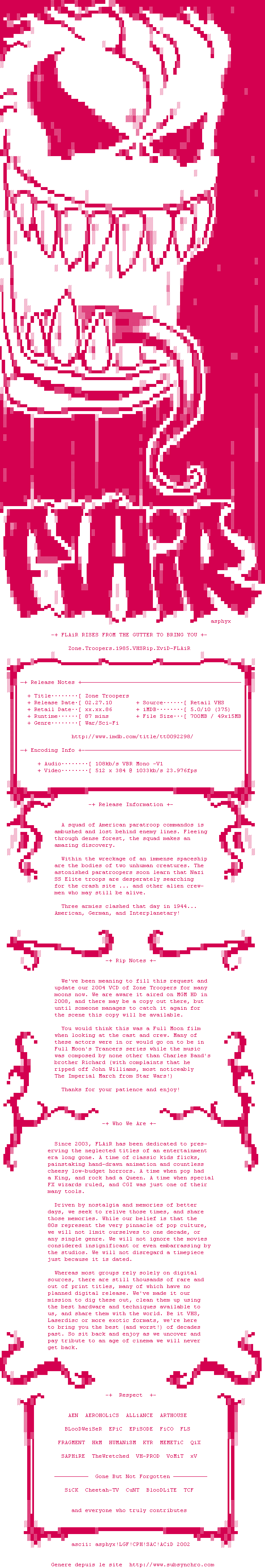 Y avez-vous pense ? Nous proposons déjà 1901 sous-titres pour le film Zone Troopers. Avez-vous essaye de voir si ces sous-titres etaient compatibles avec cette release ? On vous laisse le soin de tester cela pour nous et de contribuer au site en postant le sous-titre en cas de compatiblite constatee !