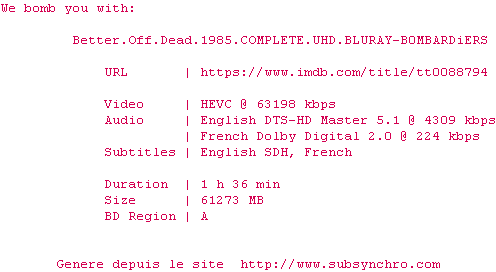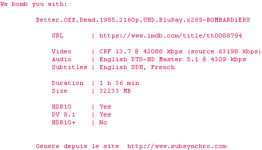 Voir le nfo de la release Better.Off.Dead.1985.2160p.UHD.BluRay.H265-MALUS