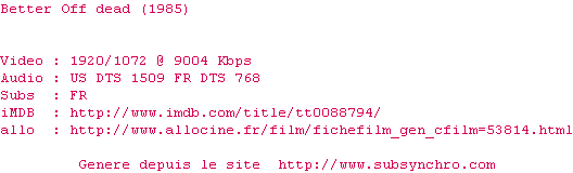 Voir le nfo de la release Better.Off.Dead.1985.1080p.BluRay.x264-Japhson