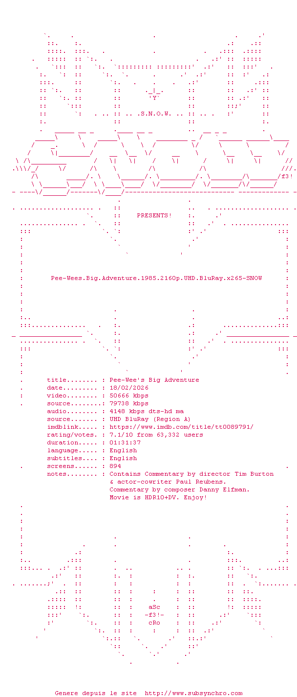 Telechargez le RSS « Fichier de la release Pee-Wees.Big.Adventure.1985.2160p.UHD.BluRay.x265-SNOW »
