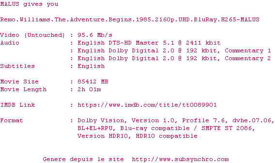 Y avez-vous pense ? Nous proposons déjà 1630 sous-titres pour le film Remo sans arme et dangereux. Avez-vous essaye de voir si ces sous-titres etaient compatibles avec cette release ? On vous laisse le soin de tester cela pour nous et de contribuer au site en postant le sous-titre en cas de compatiblite constatee !