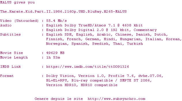 Voir le nfo de la release The.Karate.Kid.Part.II.1986.2160p.UHD.BluRay.H265-MALUS