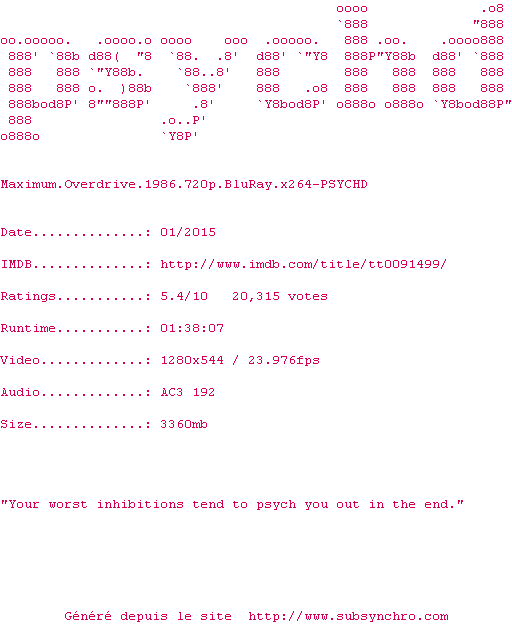 Voir le nfo de la release Maximum.Overdrive.1986.720p.BluRay.x264-PSYCHD