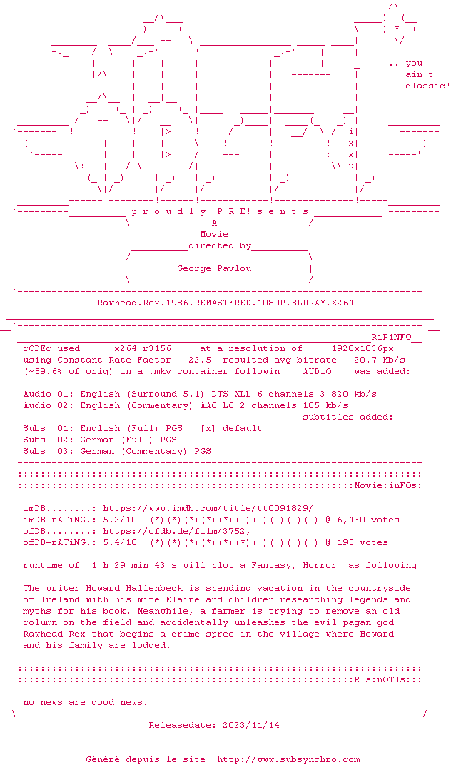Voir le nfo de la release Rawhead.Rex.1986.REMASTERED.1080P.BLURAY.x264-WATCHABLE