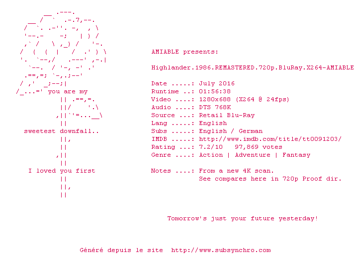 Voir le nfo de la release Highlander.1986.REMASTERED.720p.BluRay.x264-AMIABLE