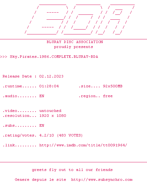 Voir le nfo de la release Sky.Pirates.1986.COMPLETE.BLURAY-BDA