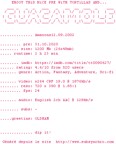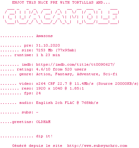 Voir le nfo de la release Amazons.1986.Integral.Version.BDRiP.x264-GUACAMOLE