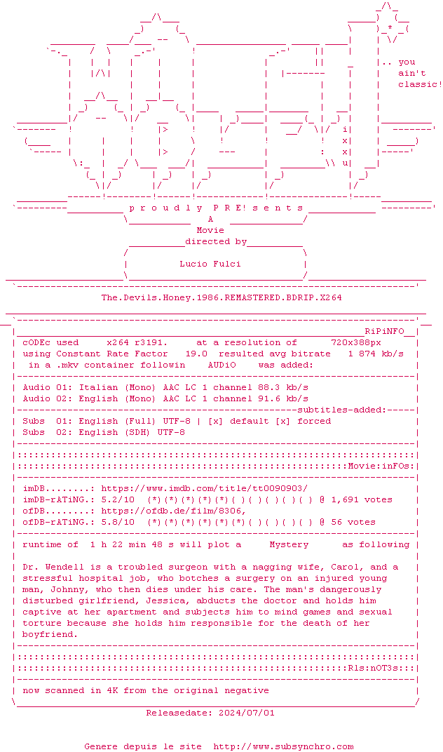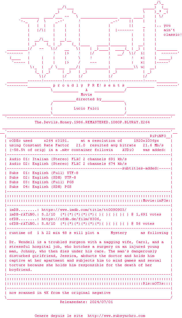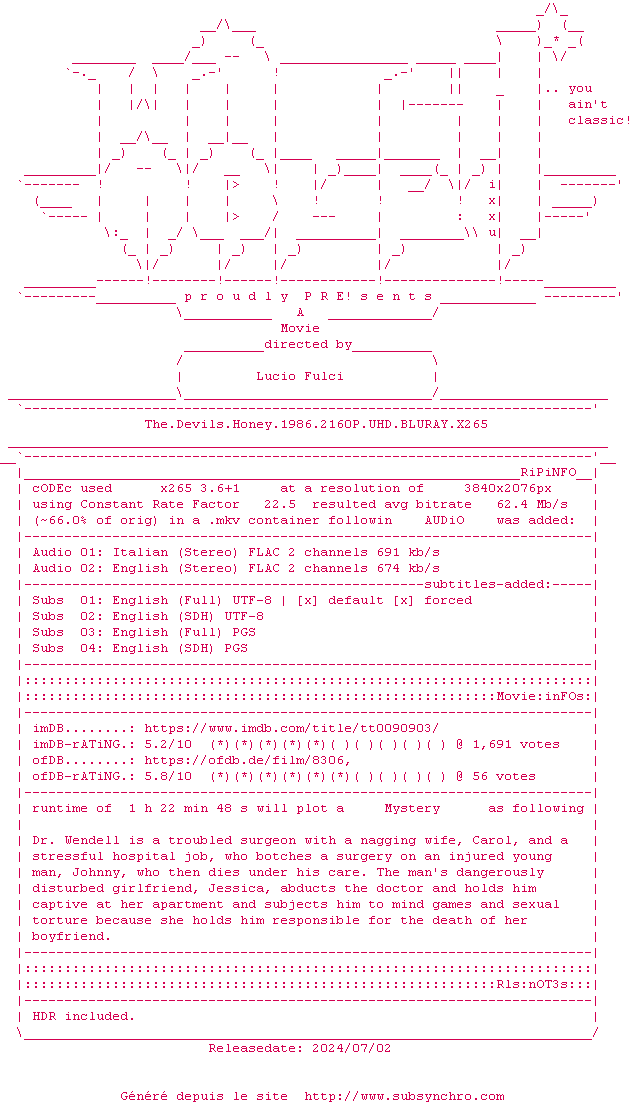 Voir le nfo de la release The.Devils.Honey.1986.2160P.UHD.BLURAY.x265-WATCHABLE
