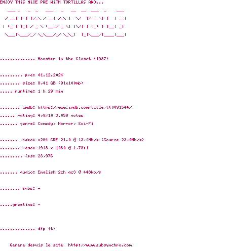 Voir le nfo de la release Monster.In.The.Closet.1987.720p.BluRay.x264-GUACAMOLE
