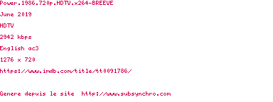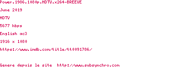 | Voir le nfo de la release Power.1986.1080p.HDTV.x264-BREEVE | BREEVE | Power.1986.1080p.HDTV.x264-BREEVE OpenSubtitles | 0 fichier | ||