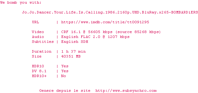 Voir le nfo de la release Jo.Jo.Dancer.Your.Life.Is.Calling.1986.2160p.UHD.BluRay.H265-MALUS