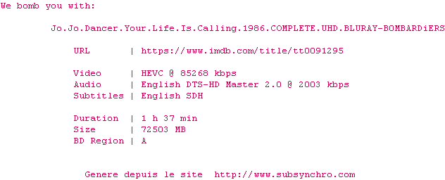 Voir le nfo de la release Jo.Jo.Dancer.Your.Life.Is.Calling.1986.COMPLETE.UHD.BLURAY-B0MBARDiERS