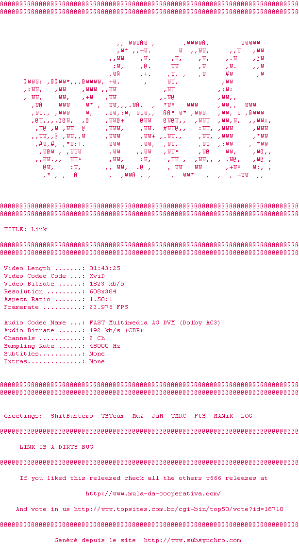 Voir le nfo de la release Link.1986.DVDRip.XviD-w666