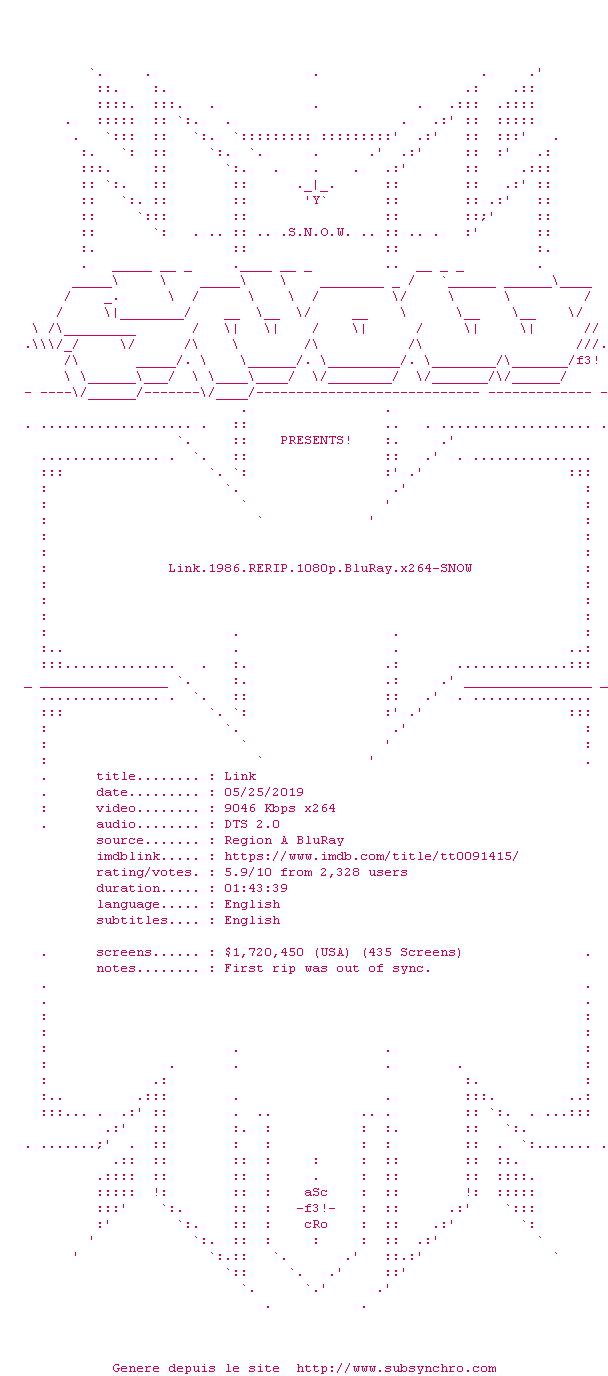 Voir le nfo de la release Link.1986.RERIP.1080p.BluRay.x264-SNOW