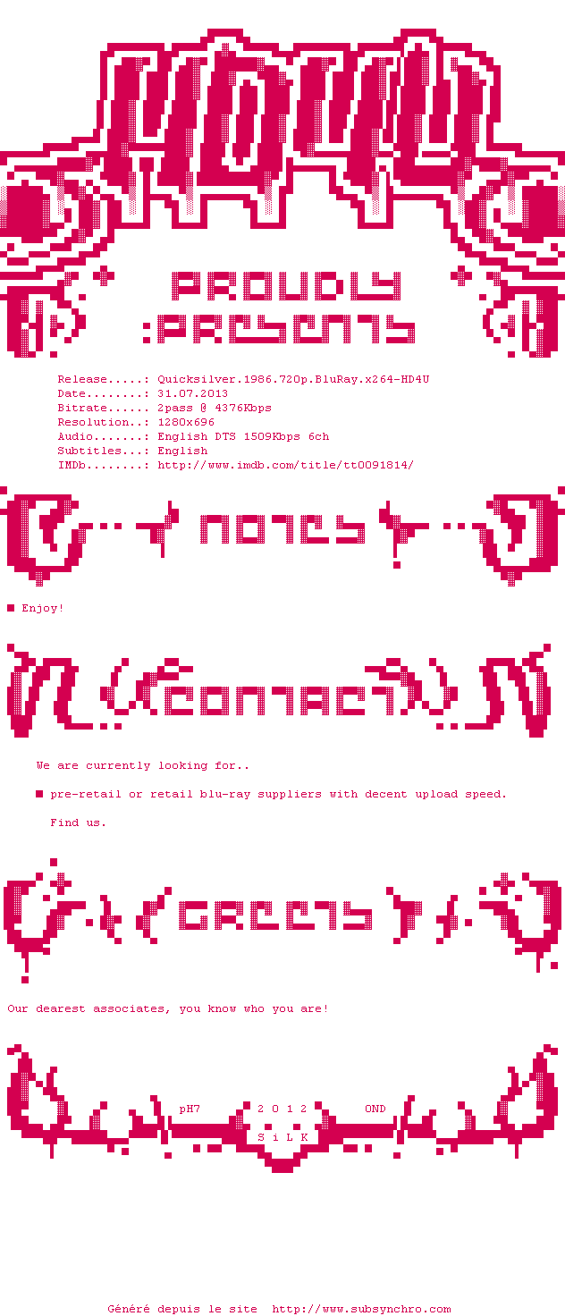 | Voir le nfo de la release Quicksilver.1986.1080p.BluRay.x264-HD4U | HD4U | Quicksilver.1986.1080p.BluRay.x264-HD4U OpenSubtitles | 0 fichier | ||