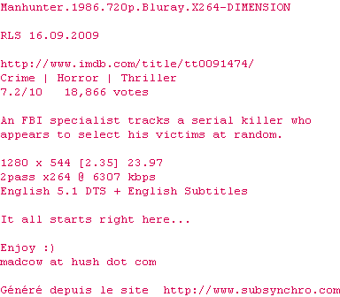 Manhunter.1986.720p.Bluray.X264-DIMENSION.srt Ajouté par Elcedz Ajoute le 26-01-2011 11:52:57 Format : SRT Italique : Non Taille : 0.00Ko Telechargement : 373 Sous-titre Extrait d'un DVD Z1 Ajouter cette release à ma collection en cas de telechargement des sous-titres 0 0 0 Telecharger le ZiP contenant NFO, Affiche, Sous-titre (*.srt) Commentez le fichier Manhunter.1986.720p.Bluray.X264-DIMENSION.srt Commentez le fichier Manhunter.1986.720p.Bluray.X264-DIMENSION.srt Commentez ce fichier Le fichier 2238-1296039177.srt n'existe pas ! Telechargez le RSS « Fichier de la release Manhunter.1986.720p.Bluray.X264-DIMENSION » Retour a la release « Manhunter.1986.720p.Bluray.X264-DIMENSION »