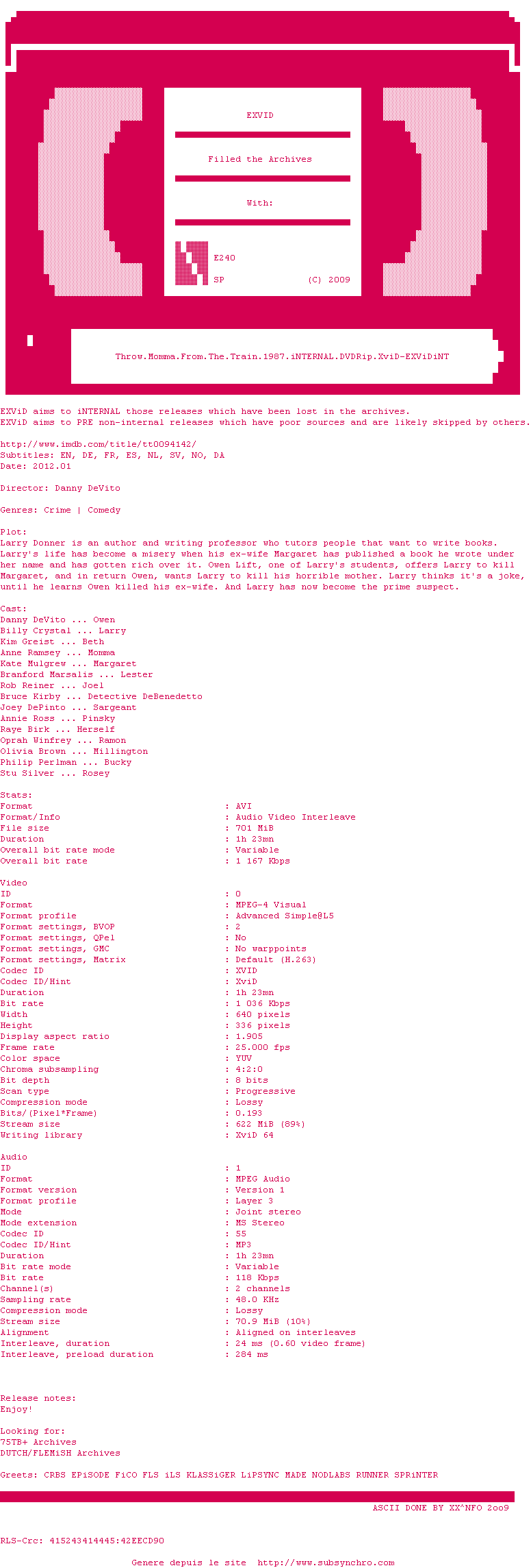 Y avez-vous pense ? Nous proposons déjà 2108 sous-titres pour le film Balance maman hors du train. Avez-vous essaye de voir si ces sous-titres etaient compatibles avec cette release ? On vous laisse le soin de tester cela pour nous et de contribuer au site en postant le sous-titre en cas de compatiblite constatee !