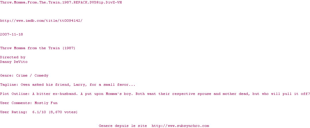 Y avez-vous pense ? Nous proposons déjà 2108 sous-titres pour le film Balance maman hors du train. Avez-vous essaye de voir si ces sous-titres etaient compatibles avec cette release ? On vous laisse le soin de tester cela pour nous et de contribuer au site en postant le sous-titre en cas de compatiblite constatee !
