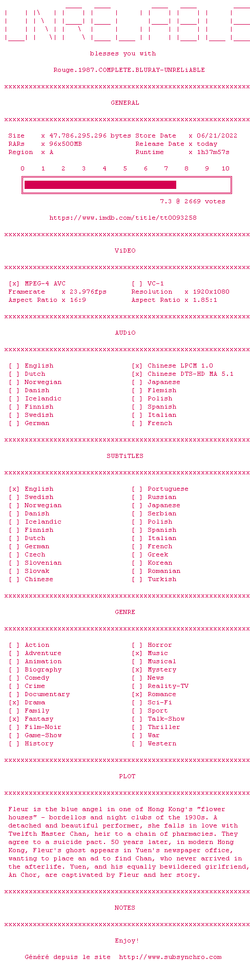 Voir le nfo de la release Rouge.1987.COMPLETE.BLURAY-UNRELiABLE