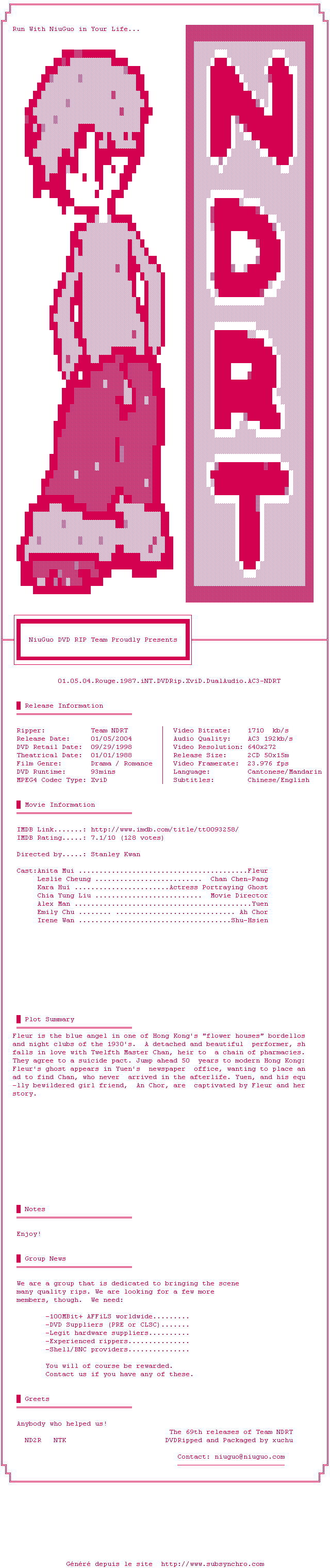 Voir le nfo de la release Rouge.1987.iNT.DVDRip.XviD.DualAudio.AC3-NDRT