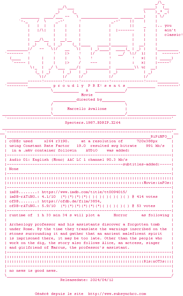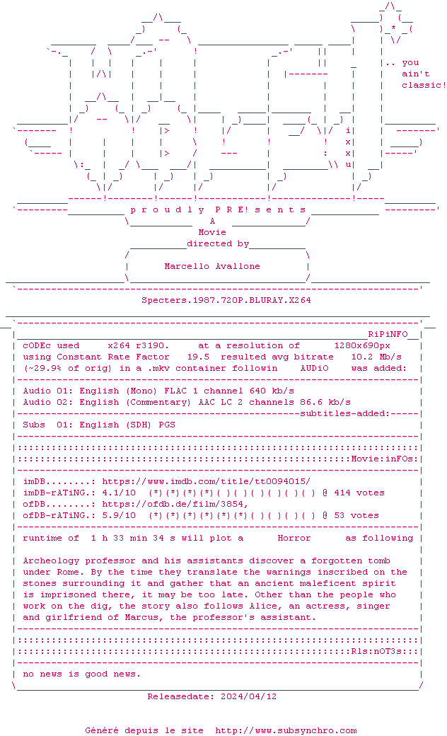 Voir le nfo de la release Specters.1987.BDRIP.x264-WATCHABLE
