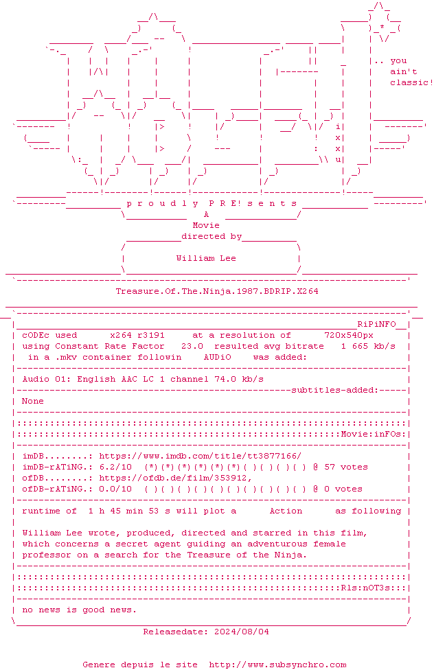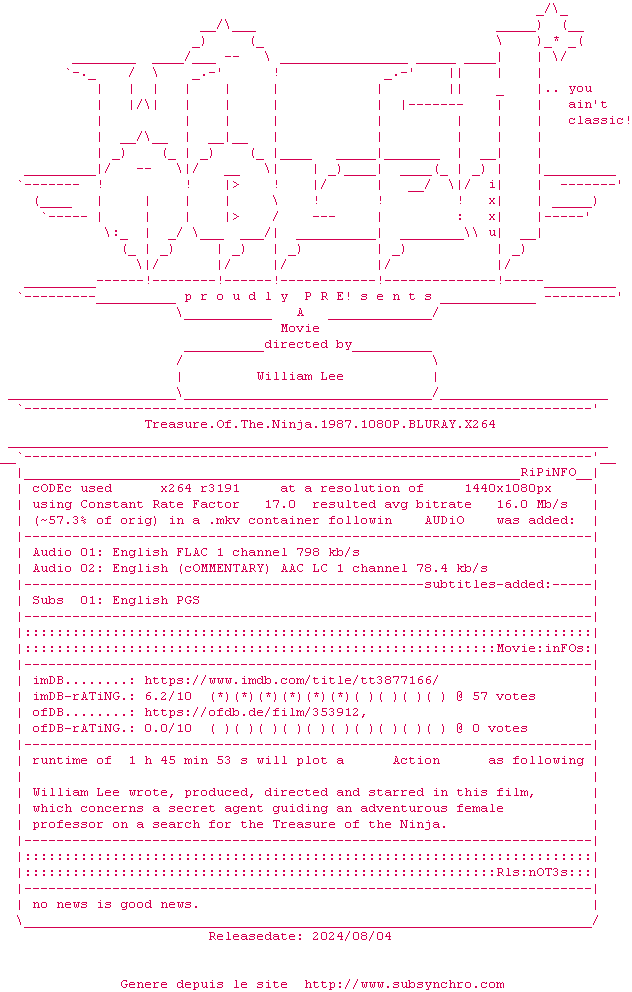 Voir le nfo de la release Treasure.Of.The.Ninja.1987.1080P.BLURAY.x264-WATCHABLE