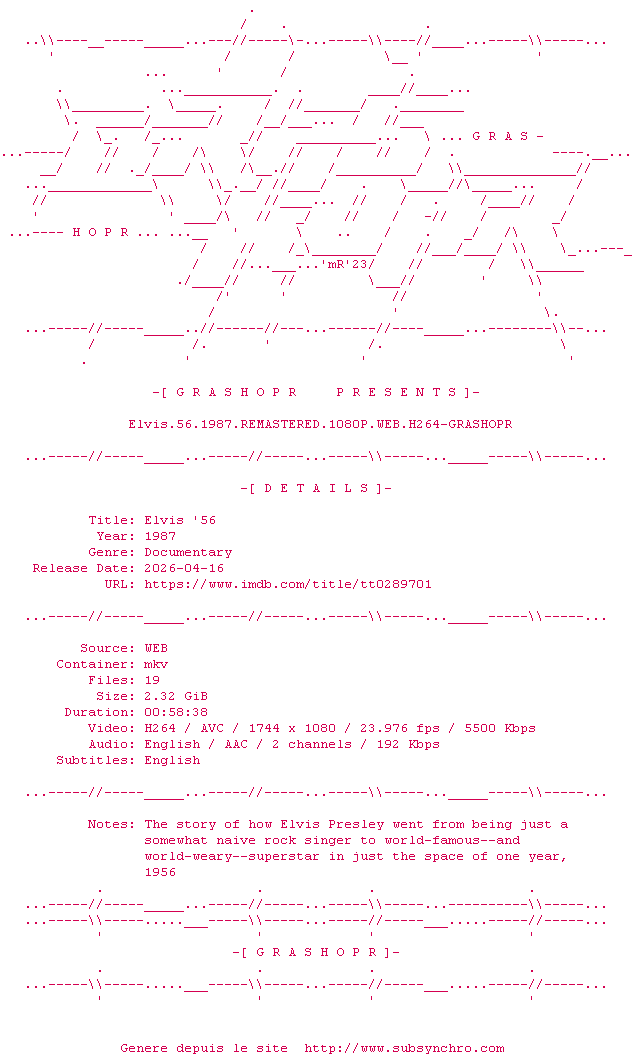 Y avez-vous pense ? Nous proposons déjà 1783 sous-titres pour le film Elvis '56. Avez-vous essaye de voir si ces sous-titres etaient compatibles avec cette release ? On vous laisse le soin de tester cela pour nous et de contribuer au site en postant le sous-titre en cas de compatiblite constatee !