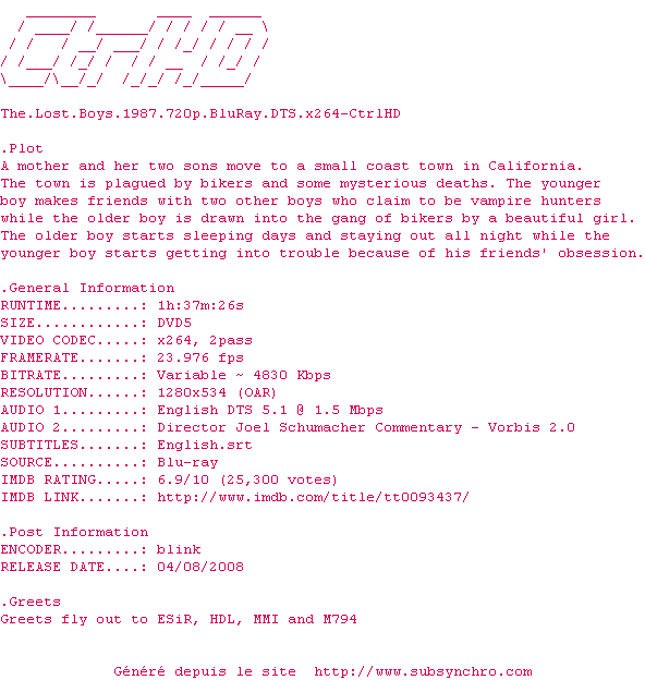 Voir le nfo de la release The.Lost.Boys.1987.720p.BluRay.DTS.x264-CtrlHD