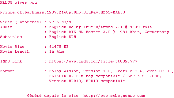 Voir le nfo de la release Prince.Of.Darkness.1987.2160p.UHD.BluRay.H265-MALUS
