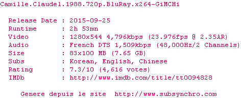 Y avez-vous pense ? Nous proposons déjà 2138 sous-titres pour le film Camille Claudel. Avez-vous essaye de voir si ces sous-titres etaient compatibles avec cette release ? On vous laisse le soin de tester cela pour nous et de contribuer au site en postant le sous-titre en cas de compatiblite constatee !