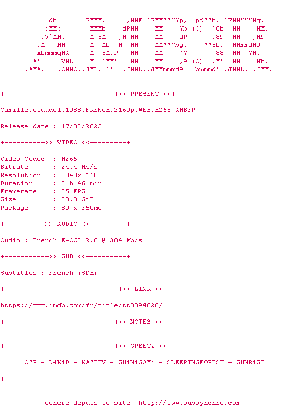 Y avez-vous pense ? Nous proposons déjà 2138 sous-titres pour le film Camille Claudel. Avez-vous essaye de voir si ces sous-titres etaient compatibles avec cette release ? On vous laisse le soin de tester cela pour nous et de contribuer au site en postant le sous-titre en cas de compatiblite constatee !