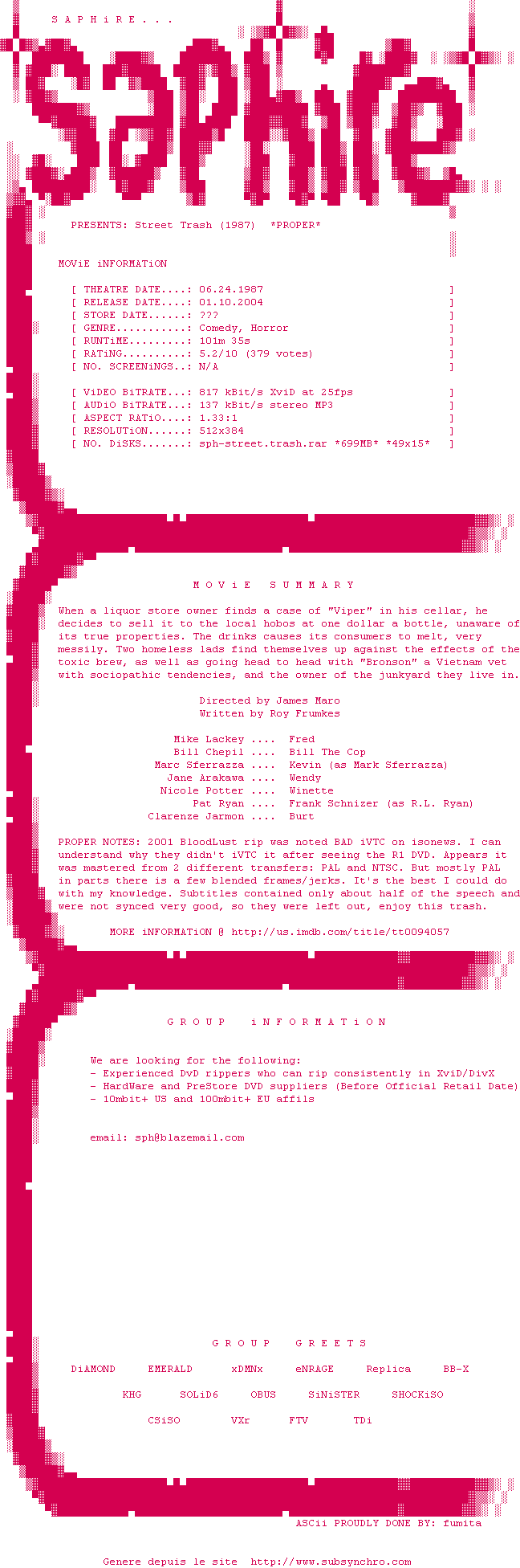 Y avez-vous pense ? Nous proposons déjà 2082 sous-titres pour le film Street Trash. Avez-vous essaye de voir si ces sous-titres etaient compatibles avec cette release ? On vous laisse le soin de tester cela pour nous et de contribuer au site en postant le sous-titre en cas de compatiblite constatee !
