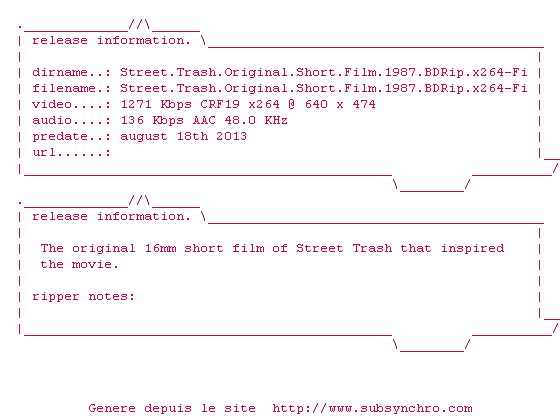 Y avez-vous pense ? Nous proposons déjà 2082 sous-titres pour le film Street Trash. Avez-vous essaye de voir si ces sous-titres etaient compatibles avec cette release ? On vous laisse le soin de tester cela pour nous et de contribuer au site en postant le sous-titre en cas de compatiblite constatee !