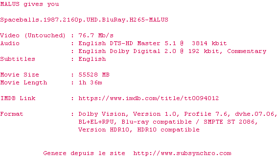 Voir le nfo de la release Spaceballs.1987.2160p.UHD.BluRay.H265-MALUS
