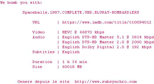 Voir le nfo de la release Spaceballs.1987.2160p.UHD.BluRay.x265-B0MBARDiERS