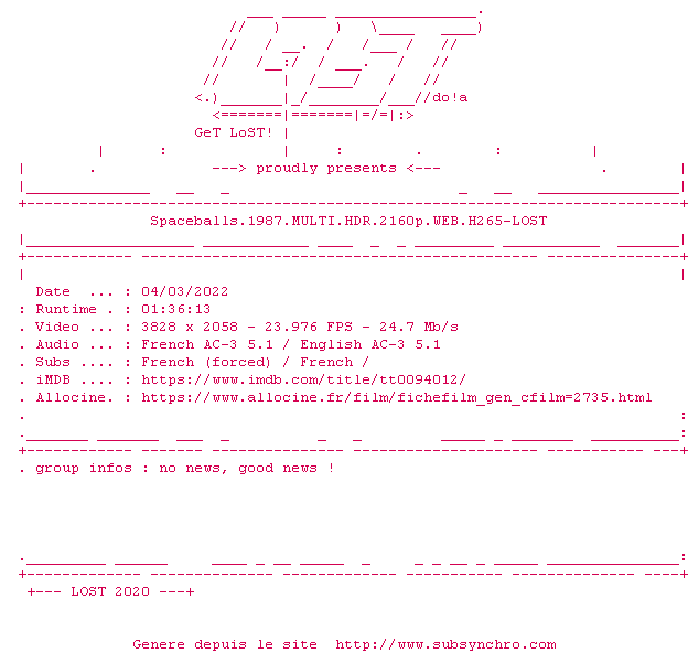 Voir le nfo de la release Spaceballs.1987.MULTI.HDR.2160p.WEB.H265-LOST