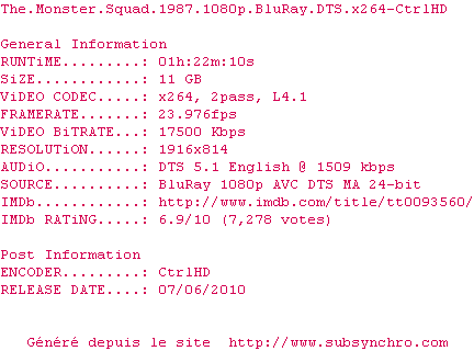 The.Monster.Squad.1987.1080p.BluRay.DTS.x264-CtrlHD-Latrell.srt Ajouté par Latrell Ajoute le 07-11-2011 00:15:12 Format : SRT Italique : Non Taille : 0.00Ko Telechargement : 164 Sous-titre Extrait d'un DVD Z2 Ajouter cette release à ma collection en cas de telechargement des sous-titres 0 0 0 Telecharger le ZiP contenant NFO, Affiche, Sous-titre (*.srt) Commentez le fichier The.Monster.Squad.1987.1080p.BluRay.DTS.x264-CtrlHD-Latrell.srt Commentez le fichier The.Monster.Squad.1987.1080p.BluRay.DTS.x264-CtrlHD-Latrell.srt Commentez ce fichier Le fichier 2605-1320621312.srt n'existe pas ! Telechargez le RSS « Fichier de la release The.Monster.Squad.1987.1080p.BluRay.DTS.x264-CtrlHD » Retour au film « The Monster Squad »