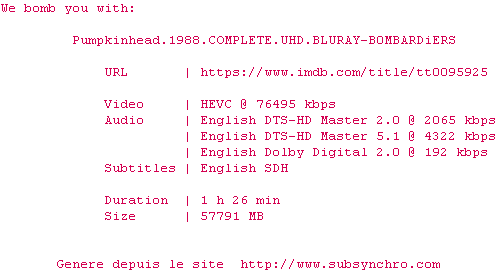 Voir le nfo de la release Pumpkinhead.1988.2160p.UHD.BluRay.x265-B0MBARDiERS