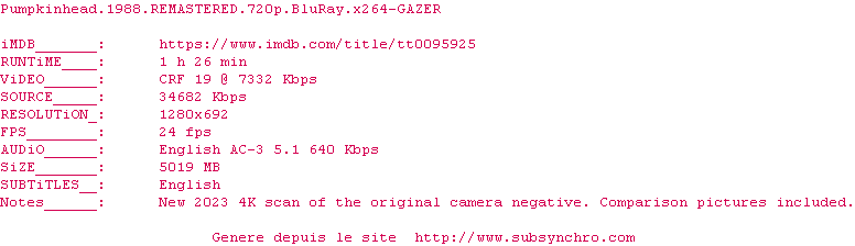 Voir le nfo de la release Pumpkinhead.1988.REMASTERED.1080p.BluRay.x264-GAZER