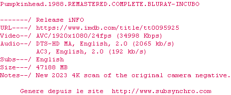 Voir le nfo de la release Pumpkinhead.1988.COMPLETE.UHD.BLURAY-B0MBARDiERS