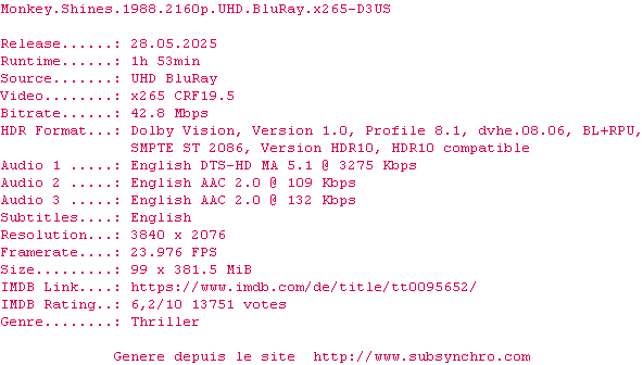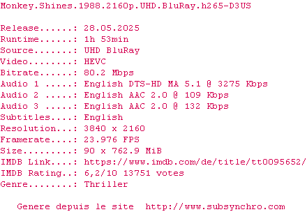 Voir le nfo de la release Monkey.Shines.1988.2160p.UHD.BluRay.H265-D3US