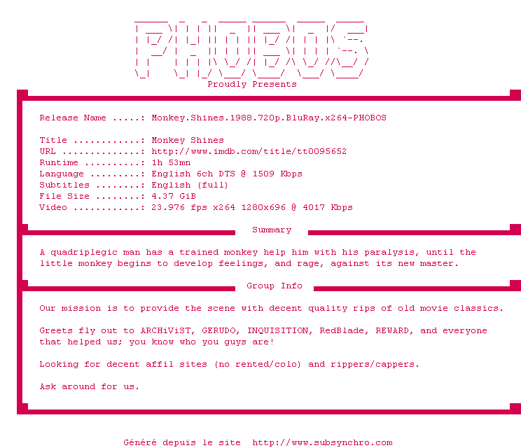 Voir le nfo de la release Monkey.Shines.1988.720p.BluRay.x264-PHOBOS
