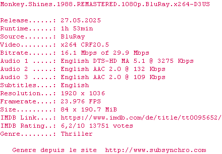 Voir le nfo de la release Monkey.Shines.1988.REMASTERED.1080p.BluRay.x264-D3US
