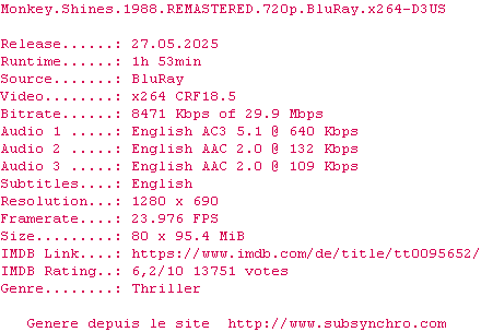Voir le nfo de la release Monkey.Shines.1988.REMASTERED.720p.BluRay.x264-D3US