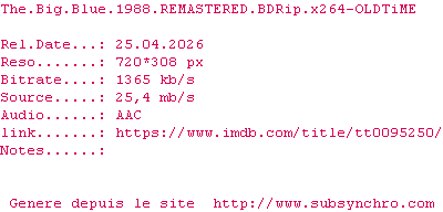 Y avez-vous pense ? Nous proposons déjà 2084 sous-titres pour le film Le Grand Bleu. Avez-vous essaye de voir si ces sous-titres etaient compatibles avec cette release ? On vous laisse le soin de tester cela pour nous et de contribuer au site en postant le sous-titre en cas de compatiblite constatee !