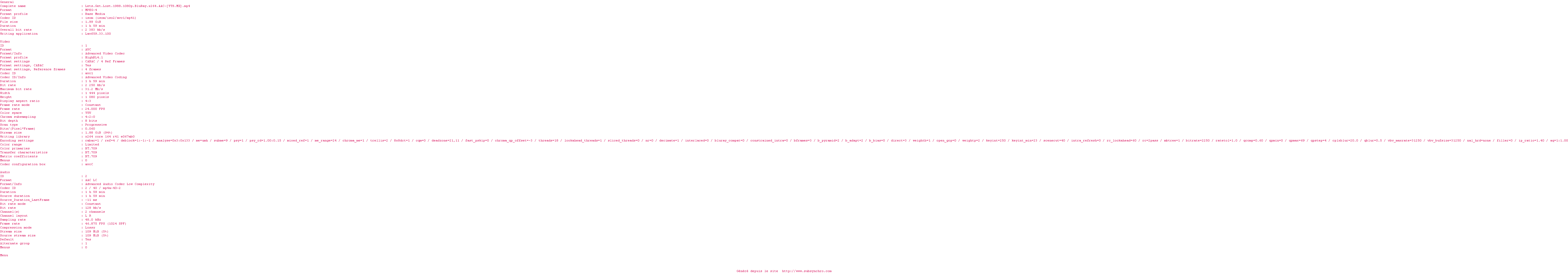 | Voir le nfo de la release Lets.Get.Lost.1988.1080p.BluRay.x264.AAC-YTS | YTS | Lets.Get.Lost.1988.1080p.BluRay.x264.AAC-YTS OpenSubtitles | 0 fichier |